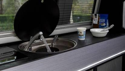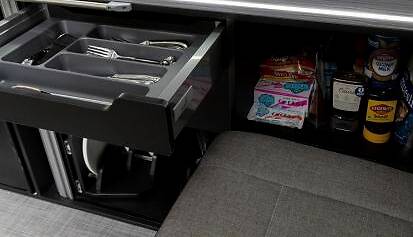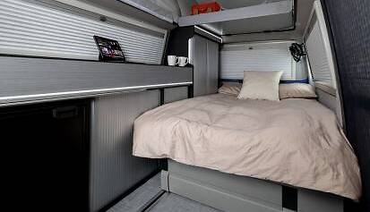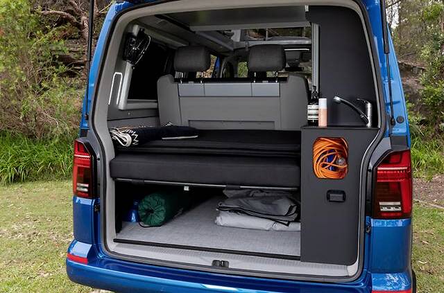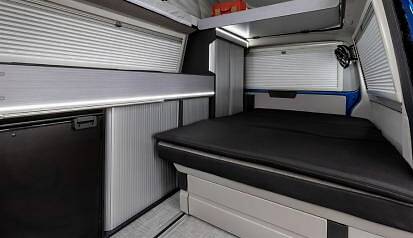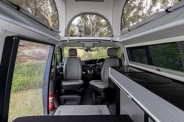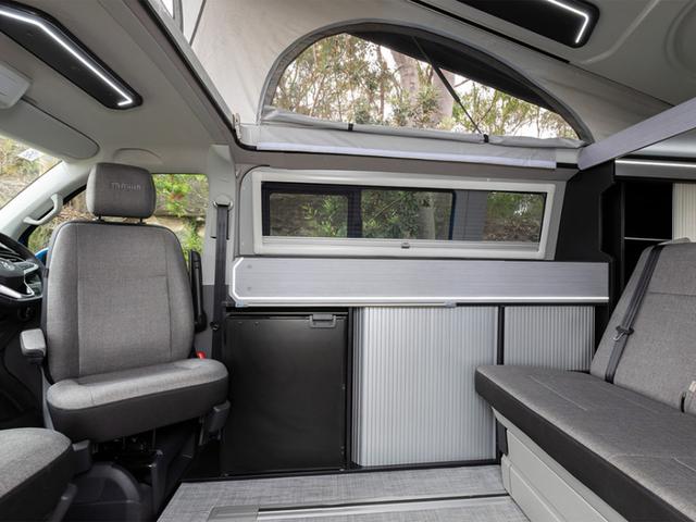 为了令房车生活更舒适,这辆车的车顶设计成弹出式帐篷顶,既能保证采光和通风,也不会影响行驶。在顶帐收起后和一辆普通T6毫无二致。一侧滑动门被封死以容纳厨房用品,包括柴油玻璃陶瓷灶具,不锈钢水槽和折叠水龙头,另外全车的电源和视听管理系统也都在这一侧。