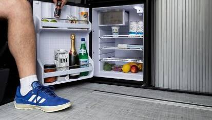 行李厢被设计成盥洗区和一张儿童床,能提供生活用水甚至是简单的淋浴功能。冰箱、餐具也有各自安放的地方。
