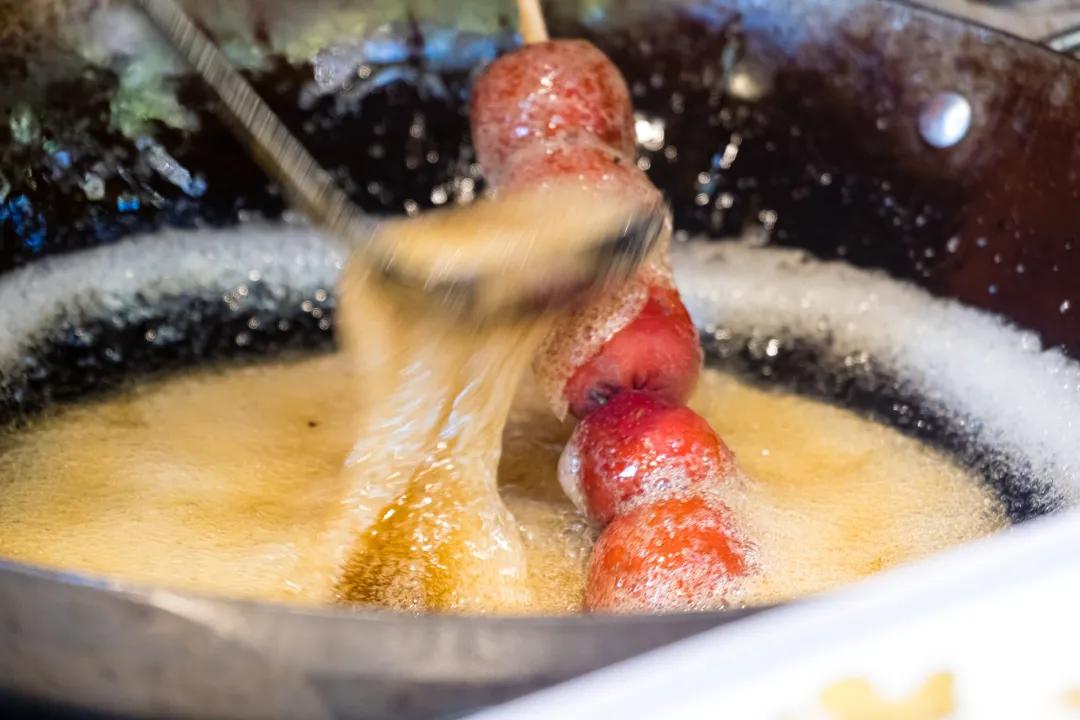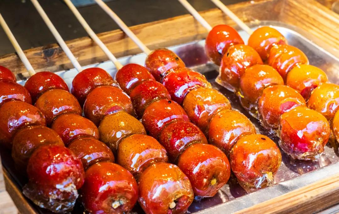 而过去北京的糖葫芦不止麦芽糖这款,还有和白糖与裹冰糖两种。据梁实秋先生记载,冰糖葫芦是最正宗的,晶莹剔透,糖不粘土,手艺好的师傅会拉出宽宽的糖挂,在冬日阳光的照耀下,简直就是颜值担当。