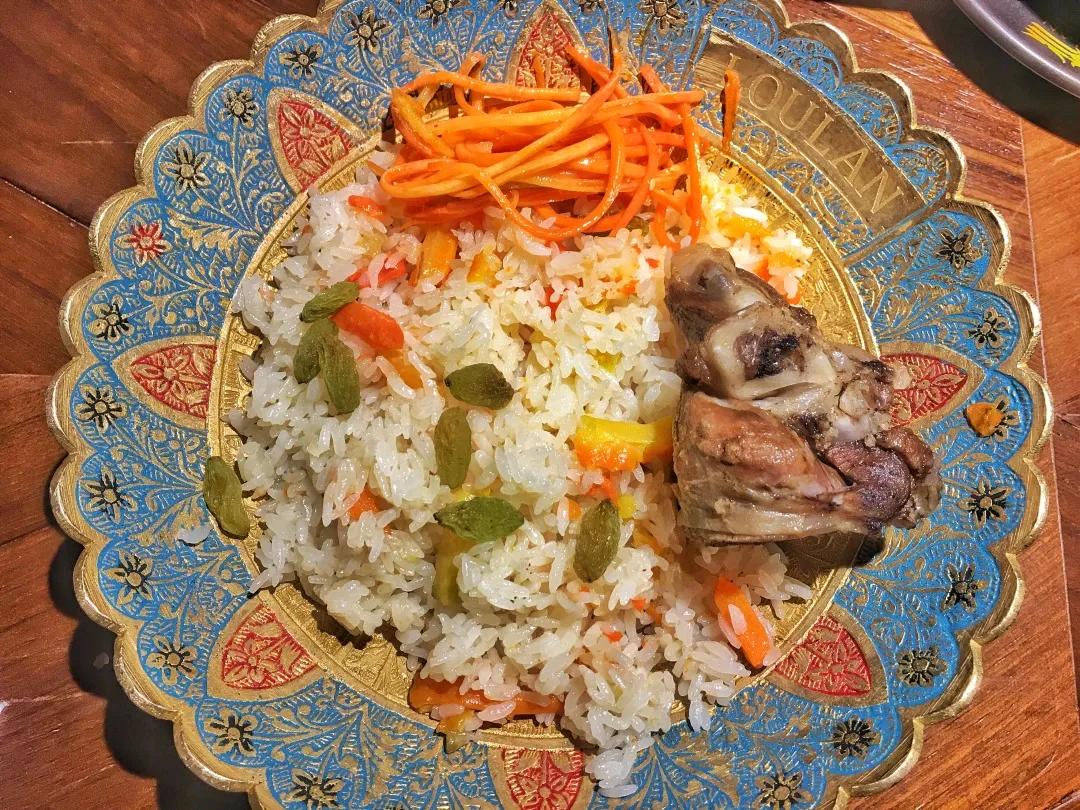 抓饭用维吾尔语来说叫“波糯”,在他们传统的日子里,比如过年或者婚嫁的时候用来招待客人。这里面还有一个故事,相传一千多年前,新疆有位医生晚年时身体很虚弱,于是研究了用羊肉、胡萝卜、大米等加盐加水后小火焖熟后的食疗吃法。后因为色香味俱全,变成了维吾尔族人普遍吃的手抓饭。