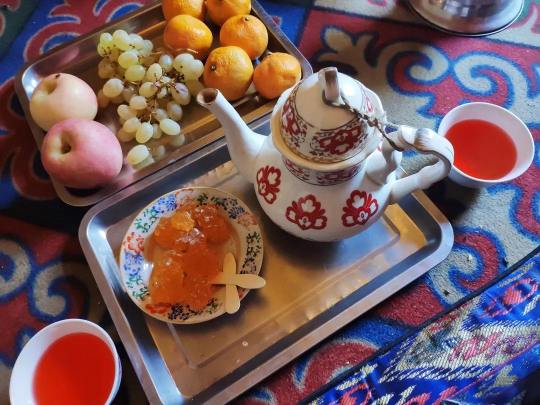 他们的传统礼节是,先请客人围坐在炕中,中间铺一块餐布,主人会端着盆和水壶,挨个请客人洗手并擦干净,最后端来几盘手抓饭,客人们直接用手抓取来吃。