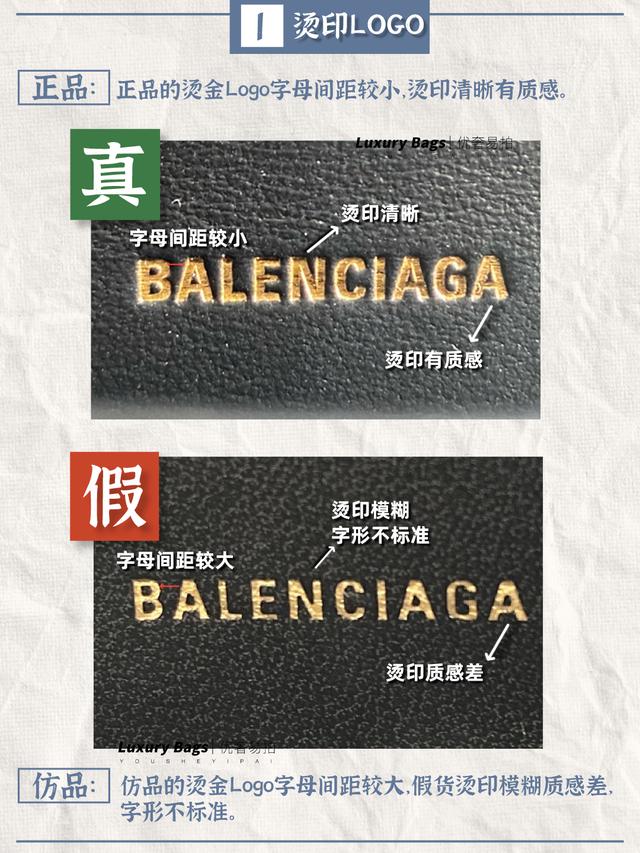 正品的烫金Logo字母间距较小,烫印清晰有质感;仿品的烫金Logo字母间距较大,假货烫印模糊质感差,字形不标准。