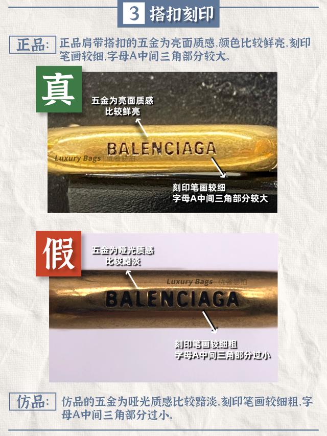 正品肩带搭扣的五金为亮面质感,颜色比较鲜亮,刻印笔画较细,字母A中间三角部分较大。