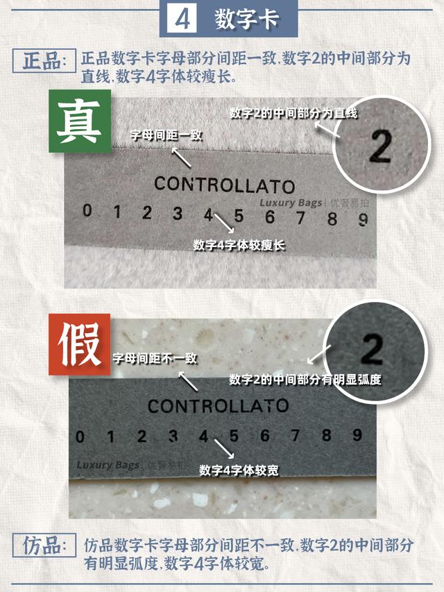 正品数字卡字母部分间距一致,数字2的中间部分为直线,数字4字体较瘦长。