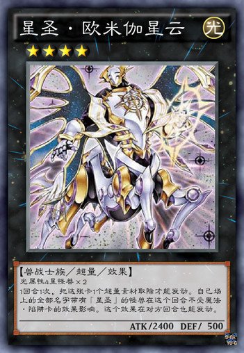 光属性4星怪兽×2;1回合1次,把这张卡1个XYZ素材取除才能发动。自己场上的全部名字带有星圣的怪兽在这个回合不受魔法·陷阱卡的效果影响。这个效果在对方回合也能发动。