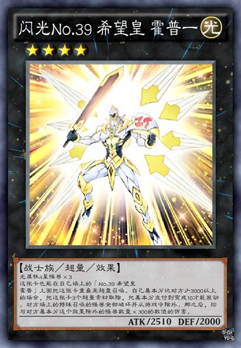 光属性4星怪兽×3;这张卡也能在自己场上的No.39 希望皇 霍普上面把这张卡重叠来XYZ召唤。自己基本分比对方少3000以上的场合,把这张卡3个XYZ素材取除,把基本分支付到变成10才能发动。对方场上的特殊召唤的怪兽全部破坏并从游戏中除外。那之后,给与对方基本分这个效果除外的怪兽数量×300的数值的伤害。
