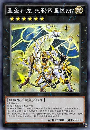 带有星圣字段,来源于天蝎座托勒密星团M7,M7可以被星圣卡组里的超量十分方便地特招。拥有着强大的赚卡能力和回收能力,无素材限制,所以M7并不仅限于星圣卡组。