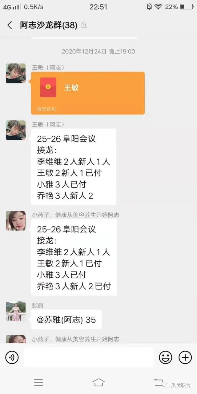 29号下午杨艳红就带着我和我女儿先去了阜阳颍州区南万达叫费洛蒙的美容店了,我表嫂李维维也在店里,店里还有五六个他们的同伙(任治超,杨艳红,王敏,于楠楠,李维维,张小楠),杨艳红轮流给我介绍认识,然后开始他们的暖身(暖身:让已加入的人,给我这样的未加入的新人。