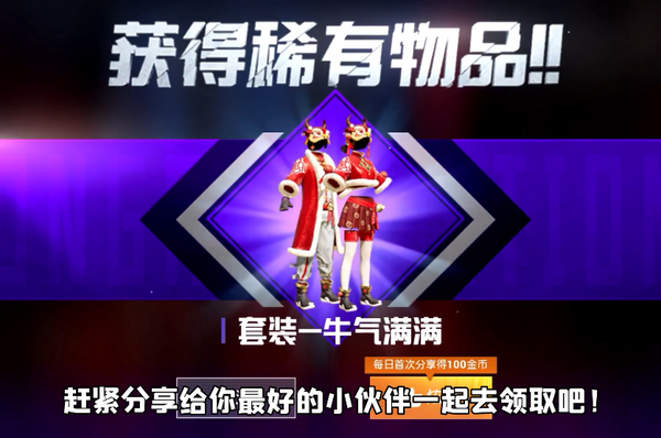 今年的新年活动,最让我们玩家喜欢的就是这次的春节皮肤了。这次牛年春节皮肤有两个让其他游戏玩家都羡慕的两个特点,一个就是获得这款皮肤的门槛真的很低,有些游戏可能为了完成得到皮肤的任务需要忙活好几天,而《和平精英》的“牛年限定皮肤”几乎没有任何门槛,只需要在活动期间内登录就可以免费领取这套限定的牛年皮肤了。所以很多玩家都马上上线领取了这套皮肤,并且分享给自己的好友,可见大家对这款皮肤的满意程度怎么样了。