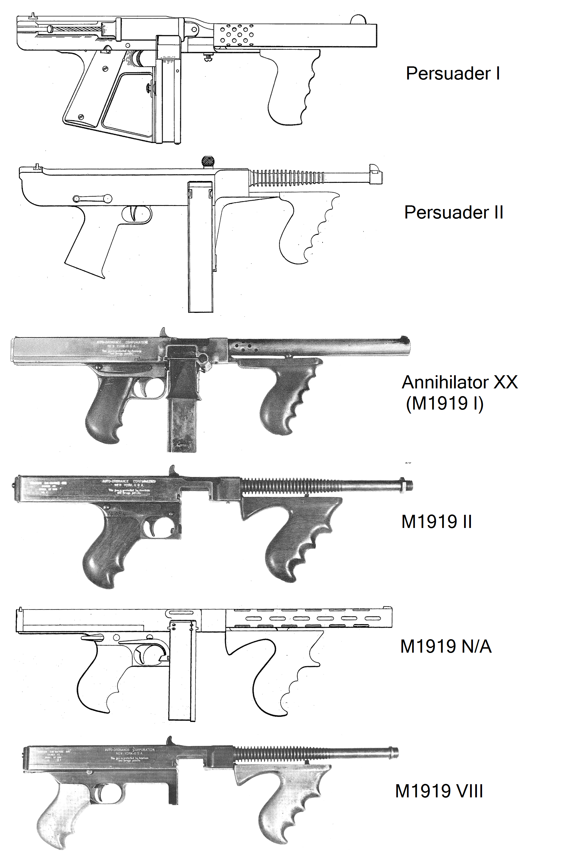 下边是汤姆逊的部分原型枪图片,虽然这里摆出的汤姆逊都没有枪托,但实际上汤姆逊的枪托是可拆卸附件,1919年的部分型号被纽约警局采购过一些,但这货当时高达1500发的射速让人有点hold不住。