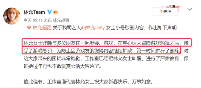 就在大家都在吃瓜,这会不会是2021年农历新年的一瓜时,林允工作室发声明回应林允小号秒删「我和颜人中恋爱了」内容,称是在真心话大冒险游戏输掉之后,接受了游戏惩罚,为防止因游戏发的内容继续扩散,第一时间进行了删除。工作室已经把林允叫醒,进行了严肃教育,保证她过年再也不敢玩真心话大冒险了。