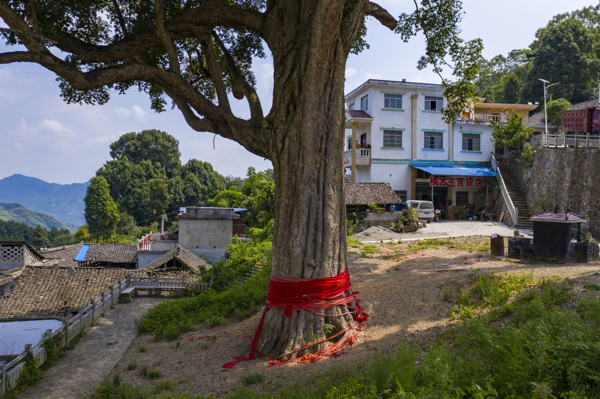 去年我自驾贵州,专程去看了这棵树,当时也见到不少游客慕名前来祭拜求好运。这棵金丝楠木树一直是“镇村之宝”,树龄超1300年,堪称亚洲楠木王。因此村子也叫楠木王村。