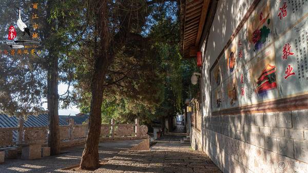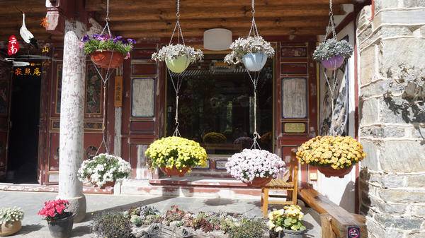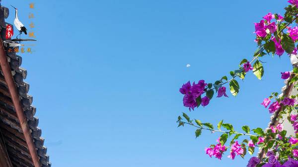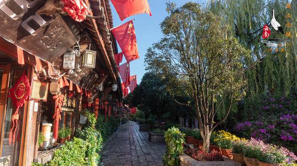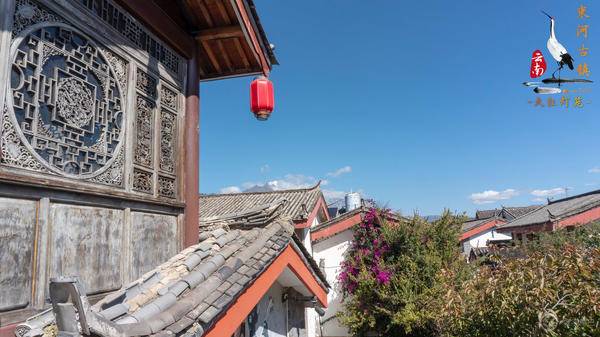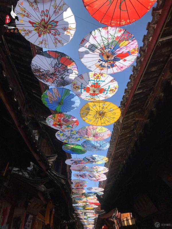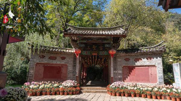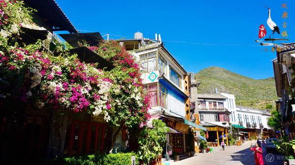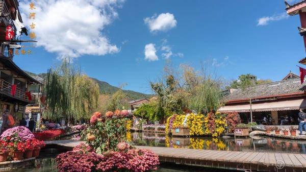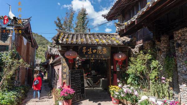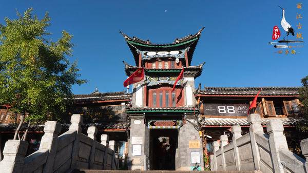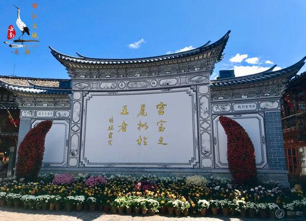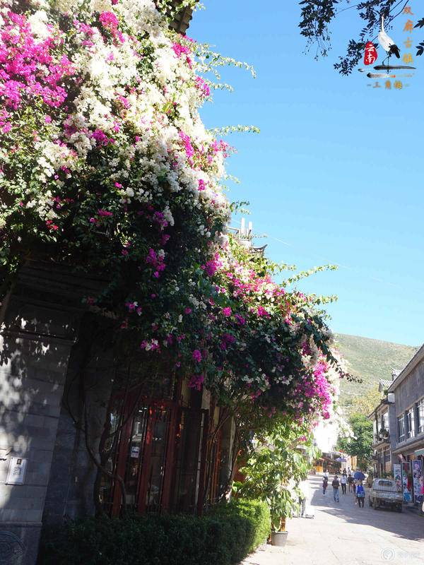 到达束河古镇已近正午,入口牌坊雕梁彩绘秀美靓丽,盘龙檐兽威严精致,红灯鲜花喜气祥和。稀疏的人流更衬出古镇的安静,脚步放缓,漫无目的的游走。沿街商铺古朴简洁让人遗忘丽江古城的浓妆艳抹,仿古'德克士'自然和谐,做旧'八角楼'八面来风;走过四方听音广场冷清落寞,驻足静静观望,仿佛听闻久远的茶马传说;荒废的商业街关门谢客,登高望远玉龙雪山巍峨挺拔,云层缥缈左右穿梭;仁里路店铺林立,红旗飘飘翠竹葱郁,闹中有静,引来众多旅拍游客;九龙潭三圣宫许愿风铃随风摩挲,青龙古桥经历数百年风雨沧桑斑驳;茶马古道博物馆重温历史通今博古,多彩油纸伞点缀古街添荣增色;飞花触水蓝天白云繁花交织迷人眼,水轩窗棂吉他低吟歌手浅唱宛转悠扬;时不时窜出的三角梅花团锦簇欢喜招摇,随处可见的黄金菊九月菊争奇斗艳招蜂引蝶…被唤醒的双眼无处安放,久久不能回神。