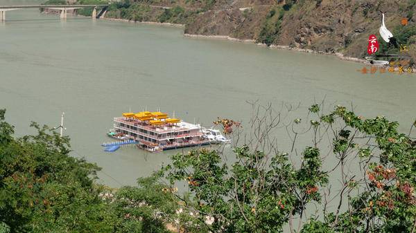 因为风景的牵引,选择在'金沙江观景台'解决午餐,独自踱步到观景台,两岸青山护拥,山路起伏跌宕,散落的村宅点缀山脚,头顶映衬蓝天白云;青黄色的江水贯穿而过奔向远方,江中心巨大的鱼排装点成富丽堂皇的食肆,美景美食宛如人间天堂…