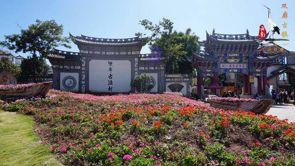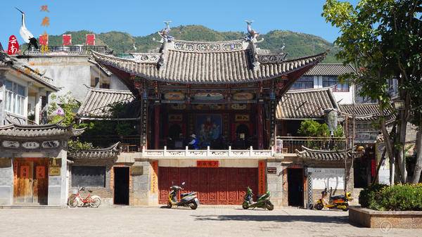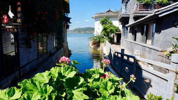 双廊处在'萝莳曲','莲花曲'两曲交界,居沙洲之上,沙洲又有南诏风情岛、玉几岛分列其左右,且'双曲'环抱'双岛'故而得名——双廊。紧致的停车场,熙攘的人群,骄阳下的景区,呈现不一样的感觉。而我仅仅是为了找寻期待的邮局,寄出早已写下文字明信片。其余时间顺着人流,漫无目的的游走,经历过喜洲的沉静,面对双廊景区的喧闹,一下子变得无所适从。繁花锦簇的照壁,绚丽多彩的牌坊,狭长曲折的石板路,古朴宁静的戏台,偶尔乍现的三角梅,散落各处的景点,一一冲入眼帘,也许是无暇应对过于商业化的氛围,疲惫感随着深入景区穆然而生,脚步也越来越沉重,来不及踏上南诏风情岛,继续剩余路线,便搭乘观光车返回入口。