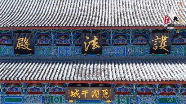 重建的'忠义石牌坊'四根石柱撑起牌坊的碑、椽、檐,坊,雕刻精湛,气势非凡。穿过木牌坊朱红仪门,转过照壁,眼前豁然开朗,中轴线式布局,议事厅,万卷楼,护法殿,光碧楼,三清殿一字排开,两侧回廊呼应,木家院和玉花园映衬,富丽堂皇,庄重秀美。