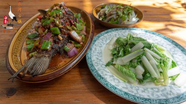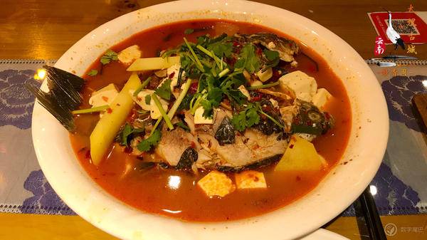 等待的时间望着橱窗外的行人,一时恍惚。上午还在泸沽湖大落水'糊涂岁月'闲情雅致,夜晚已在大理古城继续新的旅程。眼前的'妙香阁'古香古韵简约清新,服务员真诚相待,让人感到轻松自然,甚至淡雅的碗碟都觉得亲切。静候多时终于上菜,十寸深盘内两条巴掌大的鲫鱼浸在鲜红鱼汤里,混杂着豆腐,土豆条,菌片,香菜,香气扑鼻大吊胃口。飘红的鱼汤不算浓稠,味道微辣,更浓郁的味道是寻不到踪迹的酸,特意问了饭店的阿姨释疑,原来整盘菜的灵魂是云贵高原特有的酸木瓜,正是这酸木瓜,让辣的味道不再粗暴,让味蕾的冲击不再单一。鲜嫩的鱼肉,爽滑的豆腐,结实的土豆,游走的菌片也因为酸辣完美结合,大大增色,而我也迅速回血,神采奕奕的进入古城。