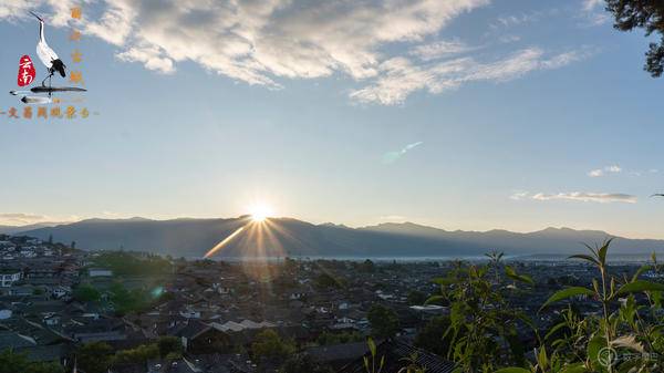 文昌宫观景台居高临下,丽江古城廊檐层叠尽收眼底,远处青山遮住旭日,散开的晨色又预示着将近的精彩。蓝天被晨色浸透,白云欢呼着拥向朝阳,天边由暗红逐渐变成鹅黄,旭日挣脱拉扯跳出青山的束缚,耀眼的光芒填满双眼,古城也一下子有了生气,新的一天拉开序幕。
