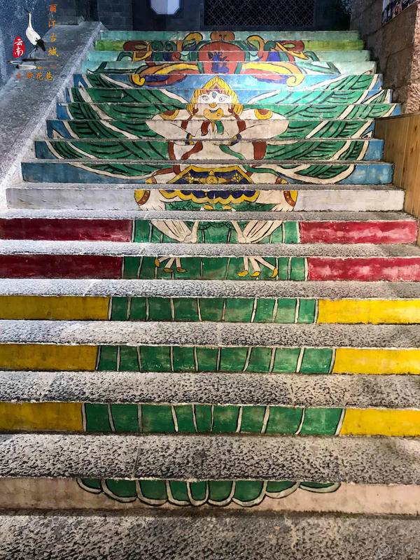 无心留恋,返回客栈修整,醒来已近黄昏,又一次扎进古城。经四方街随着人流沿东大街一路北上,兜兜转转到达'大研花巷',与丽江古城固有的喧闹不同,大研花巷似乎多了些静谧,不经意的转角,陡坡的石板路,昏暗的小巷,彩绘的台阶,仿佛每个角落都有各自的故事,让人为之动容。