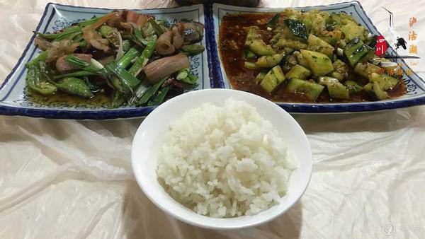 十分钟不到'辣油炝生菜'上桌,巨大的玻璃盏,鲜嫩的生菜,铺满一小层热油花椒和干辣椒,喷香扑鼻,让人瞬间口水泛滥。不多时蒜苗炒腊肉也出单,反而只有几颗朝天椒点缀,腊肉粉红诱人,弥散着香气。
