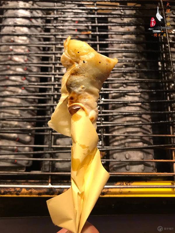 烤乳扇在几个攻略里都有提及,对实物充满期待。亲眼所见乳片隔着烤网在碳火上舞蹈,时而跳跃时而翻转,不多时乳片颜色加深,间或有奶泡冒出,留下零星的碳火斑记,鲜花酱随手一抹,竹签顺势一卷,金黄的烤乳扇跃然而出,乳香隐隐弥散,一口下去,浅浅的一层酥香,紧跟着就是绵软柔韧,唇齿间的奶香依偎着淡淡酸,细细回味,舌尖还萦绕着熟悉的玫瑰花香…
