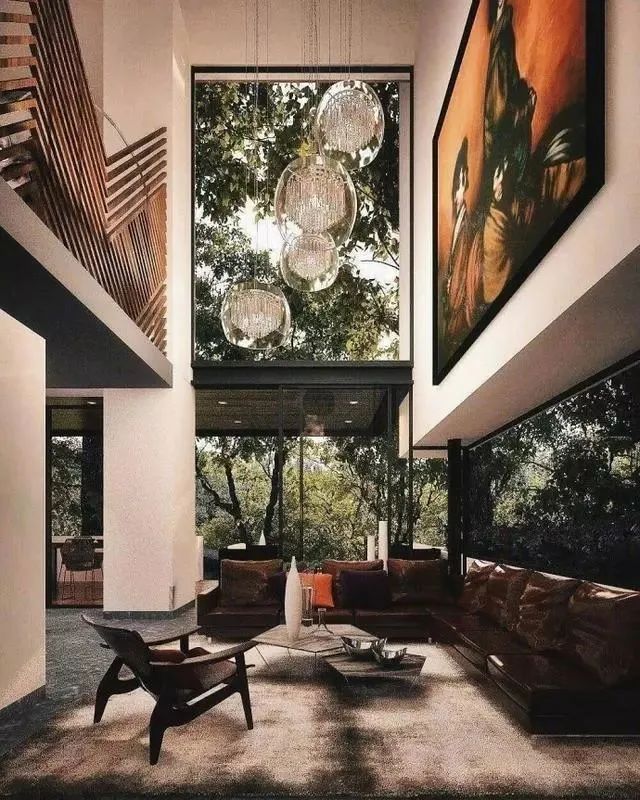 周围都是绿植,像是置身于大自然,感觉整个空气都变得清新了呢!住宅周围的透明玻璃大窗,阳光照进来,家中明亮倍增。其次映入眼帘的是非常富有个性化的吊灯和墙上的大幅海报,时尚感很强。抛开思维,远离喧嚣,在这温暖的阳光里独坐在椅子上享受大自然给予的宁静。