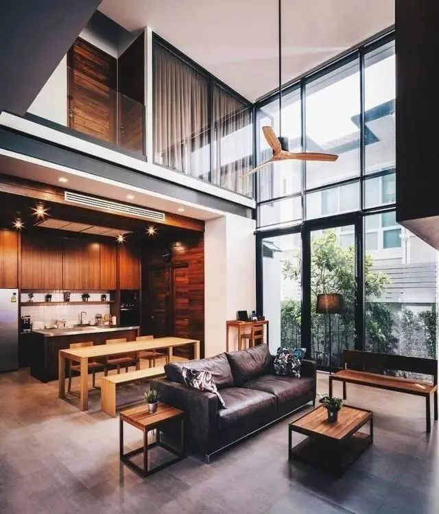 灰色的地板干净舒适,一张黑色皮质沙发,几张木质桌子,简洁时尚。沙发后面是厨房和餐厅,开放式的设计让空间更显开阔明亮。木色橱柜打造了整个厨房和楼上卧室门颜色遥相呼应。