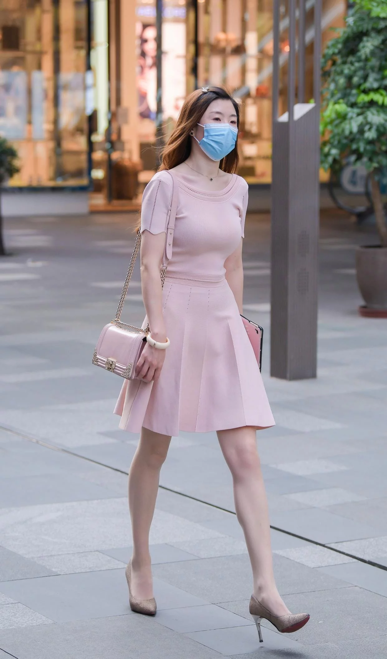 看下照片中的这个美女,虽然戴着口罩,但可以感受到美女的年龄应该在三十到四十岁之间,虽然年龄稍大,但身材保养得确实不错,长发披肩给人一种非常妩媚的感觉。美女选择了一款粉色连衣裙,裙子采用了针织面料,柔软舒适又透气是针织面料最大的优点,而且还微微带着一点弹性,这样可以更好地展示美女的身材曲线。