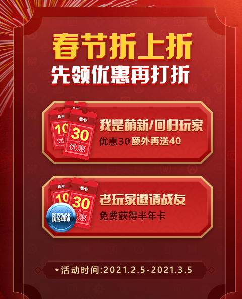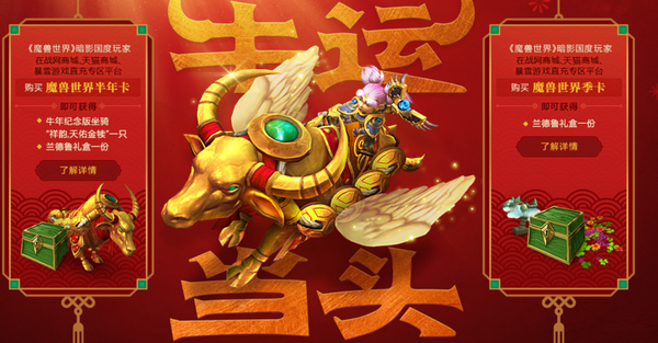 活动一,暴雪打折季。在2月22日之前,你可以用310元的价格充值半年卡,并获赠牛年坐骑一头;或是用188元的价格充值季卡,并获赠兰德鲁的礼物盒一份。