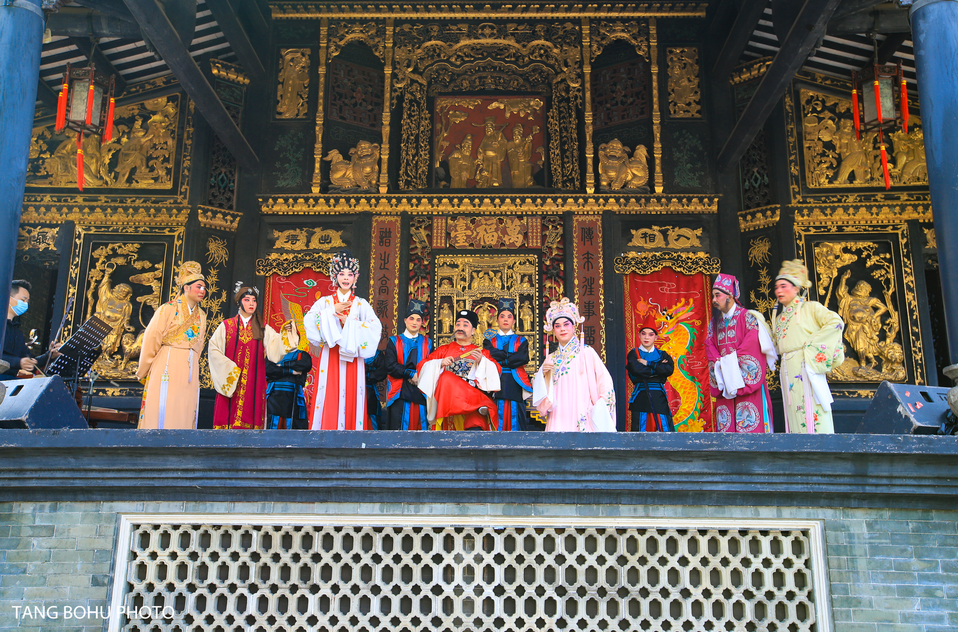 在祖庙的对面有一座戏台,戏台的后面雕刻着精美的图案。禅城是广东木雕的重要产地之一,以红木雕刻为主,也有贴上金箔而成为金漆木雕,禅城木雕以其刀法利落,线条简练,大气。