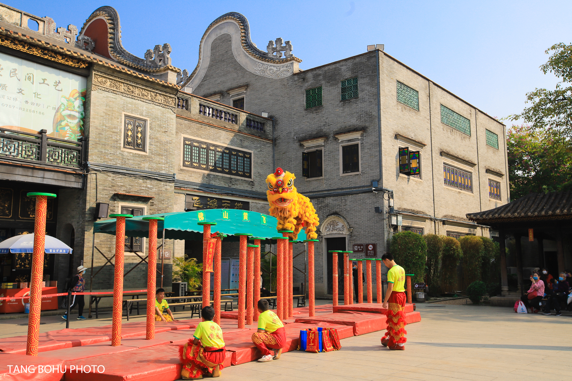 就在黄飞鸿纪念馆前面每天都有表演醒狮,在传统的佛山过年习俗中,舞醒狮庆春节是不可缺少的节目。从大年初一开始,很多村里的祠堂前,或者小镇的街道里,都能听到锣鼓的响声,都能看到醒狮。