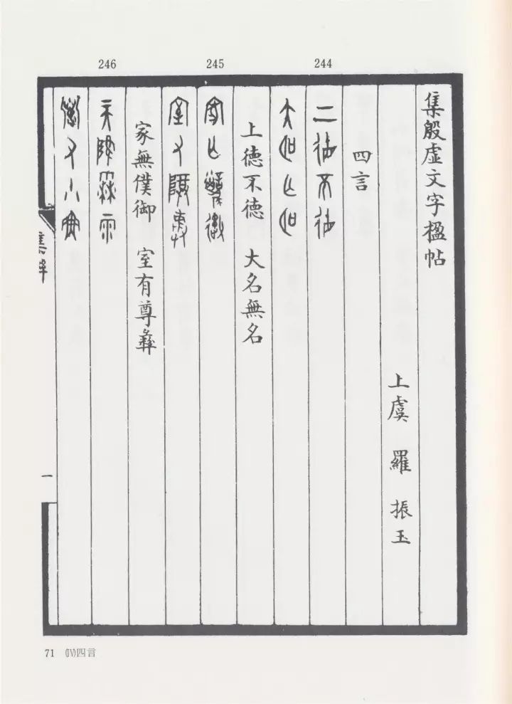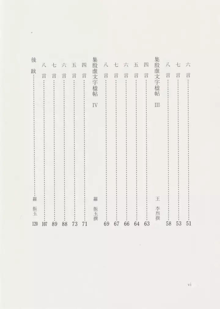 继罗氏之后,有章钰、高德馨、王季烈等同好也纷纷效仿,集甲骨文字为楹联,1927年又以《集殷墟文字楹帖汇编》为名由东方学会出版为线装石印本,汇总罗、章、高、王四家集联而成书,共收四言、五言、六言、七言、八言、十言等400余联,由罗振玉亲自手书付印。1985年,四家集联汇编又以《集殷墟文字楹帖》为书名由吉林大学出版社放大重印(只是排列顺序上将罗振玉集联提到前面,由原来的章、高、王、罗变为罗、章、高、王)。此外日本内山知也又对罗氏《汇编》作日文译注,编为《甲骨文墨场必携》一书,1986年由东京木耳社出版。