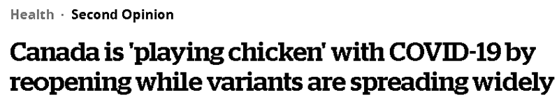△加拿大广播公司(CBC)发表的《加拿大在变异病毒广泛传播之际恢复开放是与新冠病毒玩“胆小鬼游戏”》