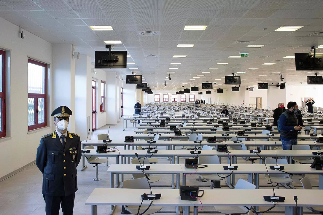 现场有600名律师,900名证人,无法计数的来自全世界的国际记者,1000多个旁听席,还有355名黑手党成员和腐败议员、警察、前高官。