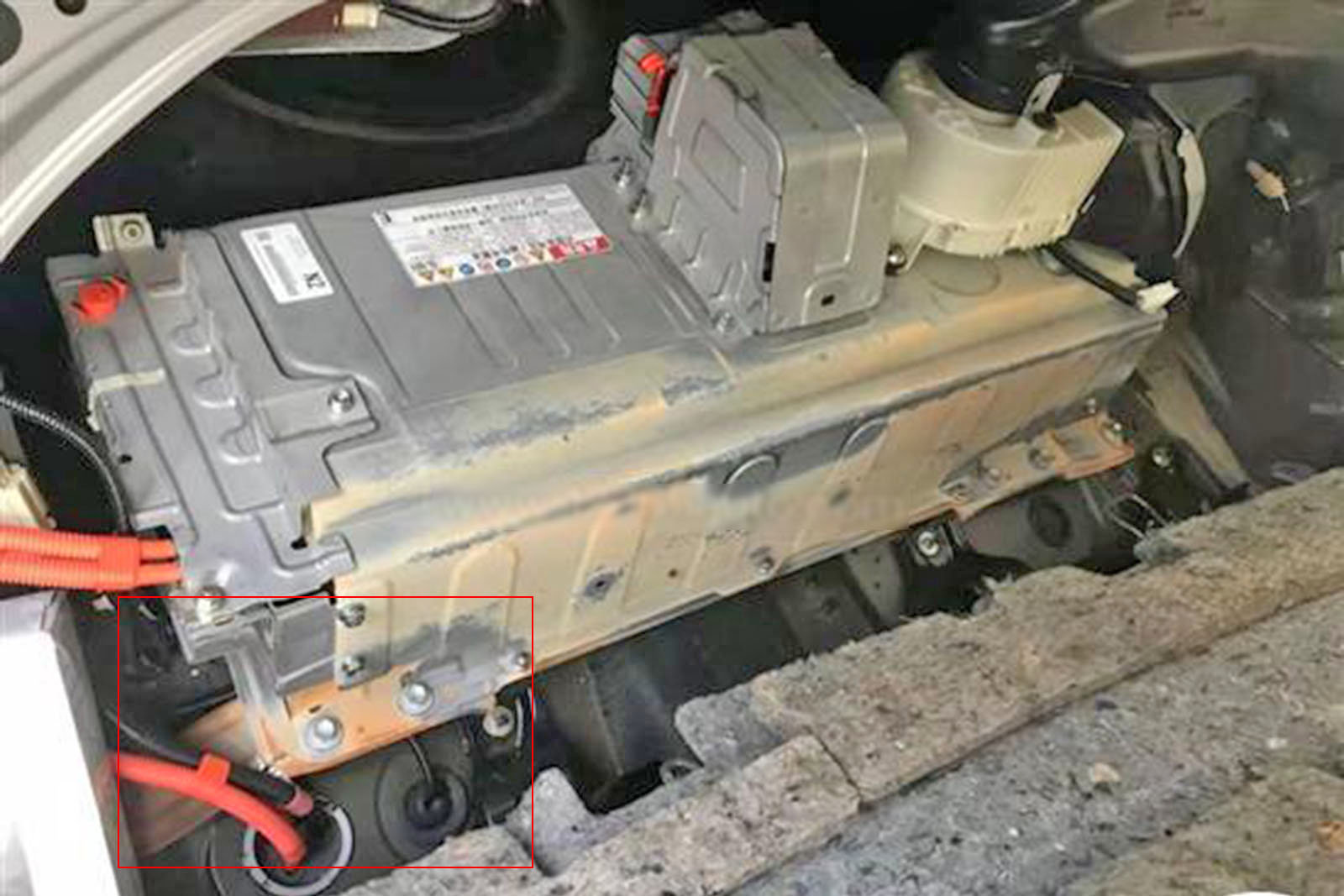 下图为动力电池另一侧,我们能看到红框中的部位确实出现了局部锈蚀。
