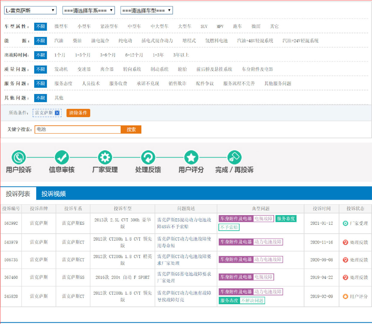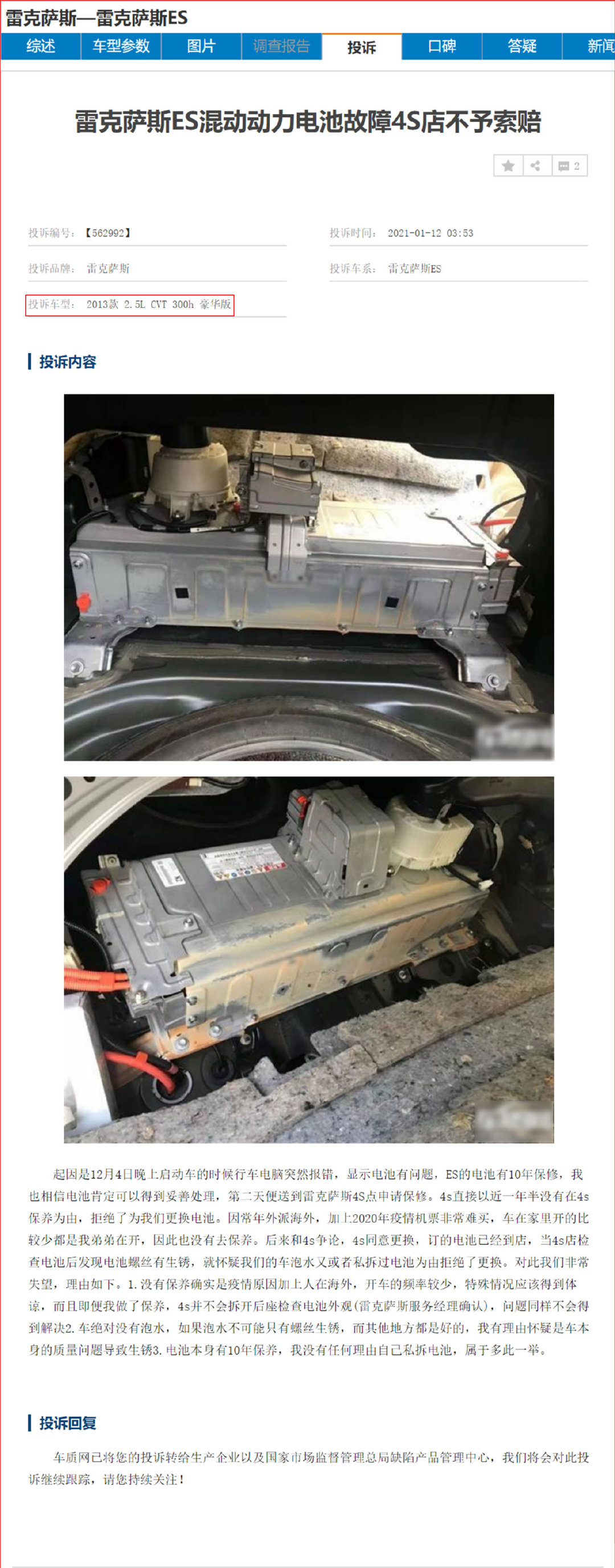 2021年1月12日,一辆2013款雷克萨斯ES300h投诉动力电池故障不予索赔,我们来看看具体内容,见下图: