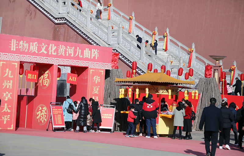 此外,游客在园区内还可以体验非遗民俗活动转九曲,沿途的“堆金山”、“开运锣”、“传福鼓”、“五福树”等互动体验项目,也是让游客兴致大增。游客在转九曲的过程中可以收获丰富的民俗体验。