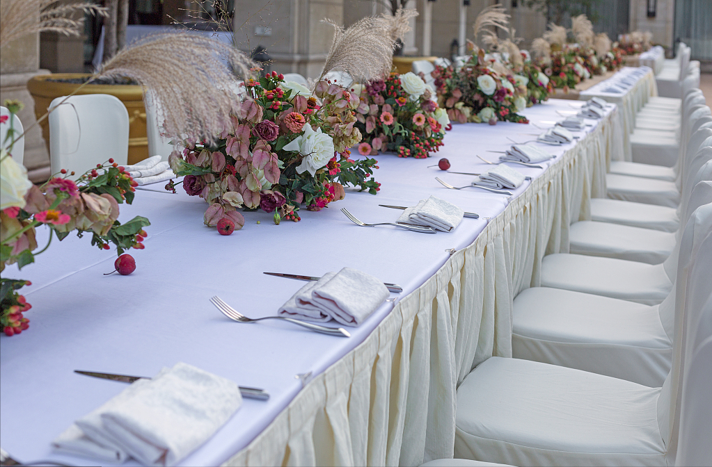 如果是在户外用餐,餐桌上、甜品台上的鲜花装饰必不可少,婚礼场景的布置是让每一位宾客最快进入你们婚礼状态的方式了,浪漫又有仪式感。
