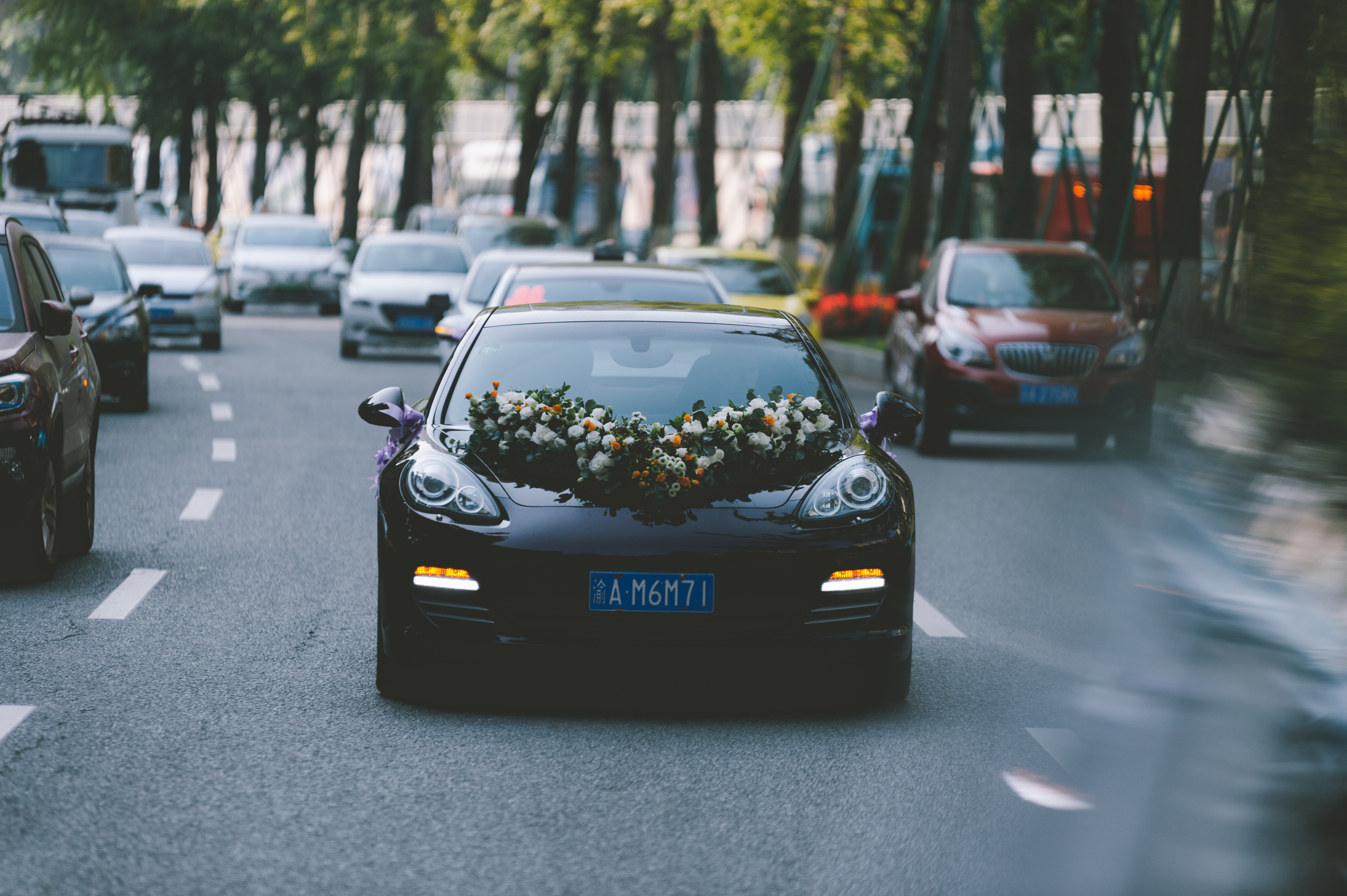 婚车扎花最重要的就是头车的鲜花装饰了,一般会选择与新娘手捧花同色系的鲜花、绿植组合装饰,一般车头花的样式造型有V型、名字缩写、心形、或者一些个性logo,其实婚车的装饰还是越简单越大气。因为主婚车一般都会用比较名贵的车,行驶在路上就是比较显眼的,而过于复杂的装饰会掩盖车自身的价值。