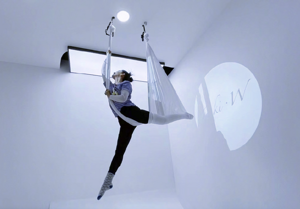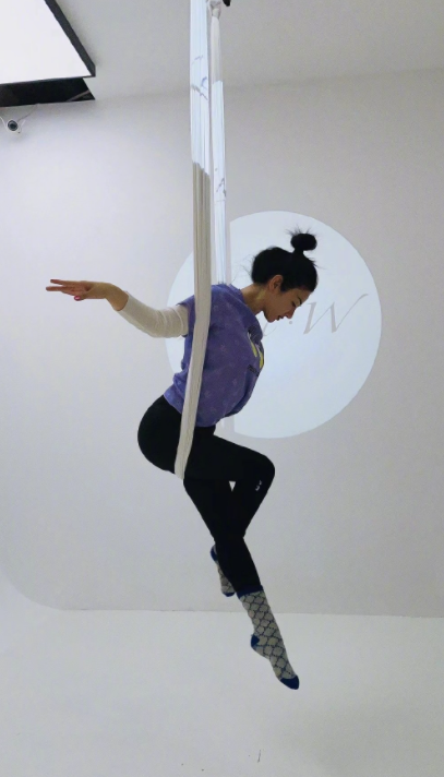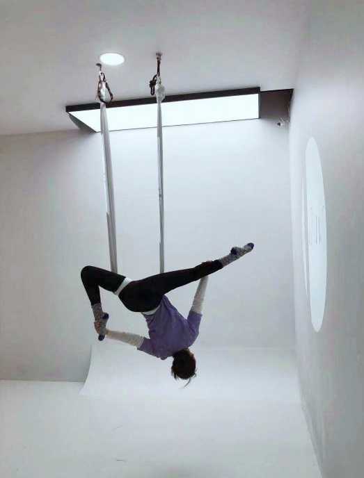 只见黄奕穿着运动装悬挂在空中,只凭一根绸缎缠住腰部和腿部,大胆做出倒立劈叉的动作。