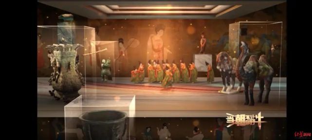 背景里再配以“妇好鸮尊”“莲鹤方壶”“贾湖骨笛”“捣练图”“簪花仕女图”“备骑出行图”“千里江山图”等七大国宝。