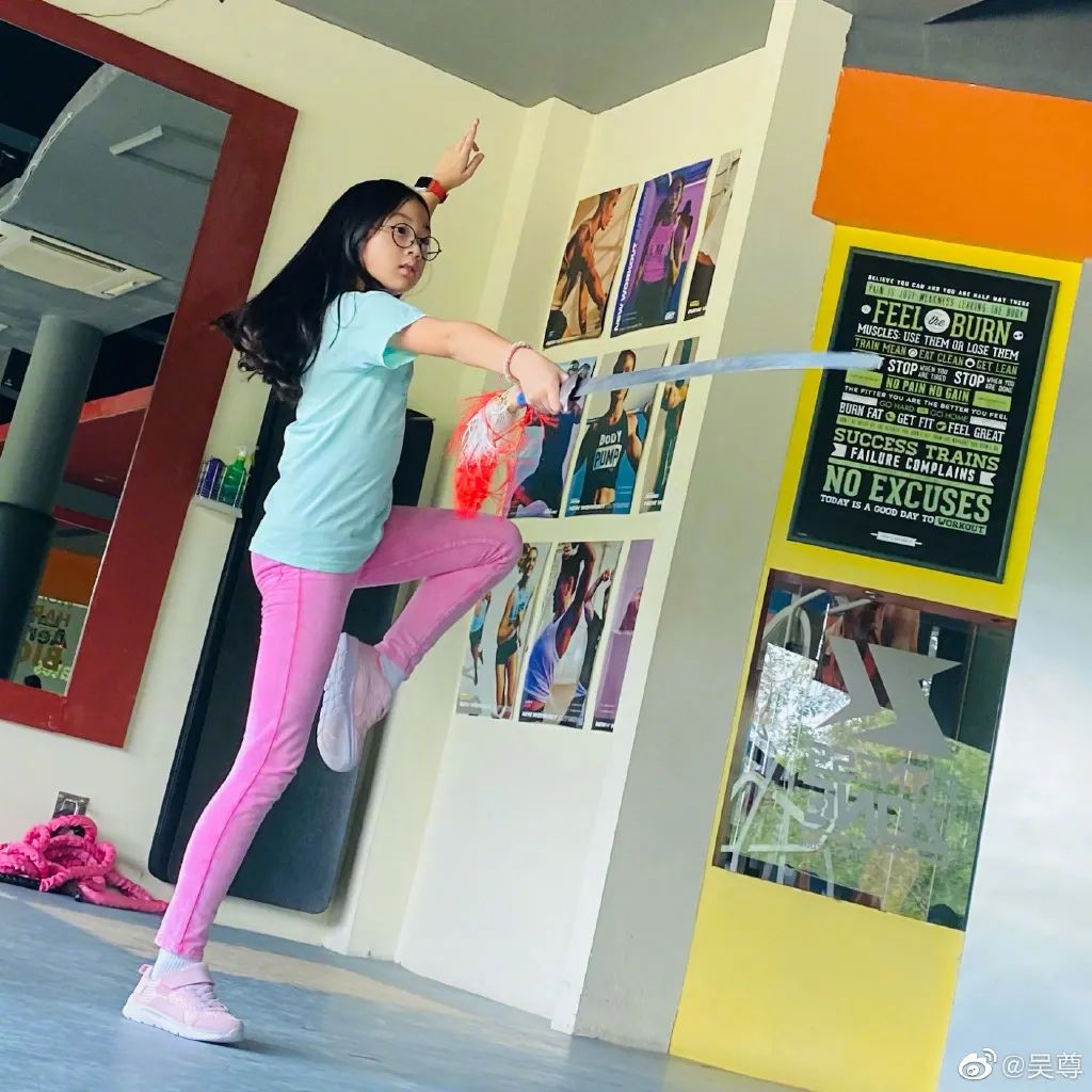 女儿上舞剑课,吴尊会陪着,还会给Neinei拍美美的照片。