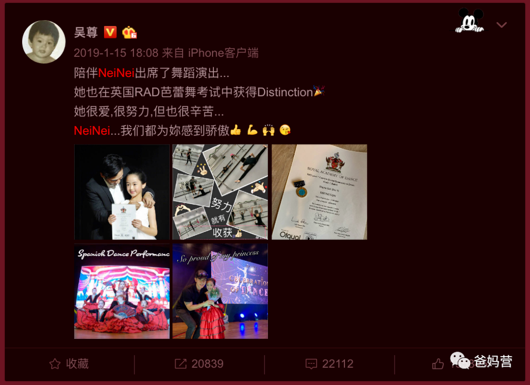 除了学校的课业外,Neinei还专门参加各种亚洲芭蕾比赛,并在英国RAD芭蕾舞考试,也就是英国皇家舞蹈学院考试中获得Distinction 优秀的级别,网上很多借此说吴尊想让Neinei考牛津,甚至说他的教育一个顶8个海淀妈妈,这是有点瞎扯了,吴尊孩子看起来是孩子妈妈带的。。。