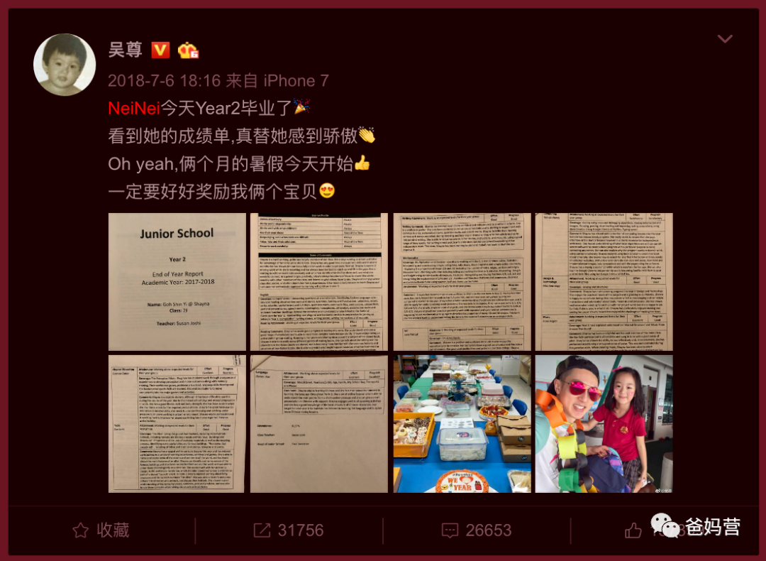 有一次,吴尊Po出女儿Neinei 小学二年级(按英式学制,相当于国内小学一年级)的成绩单,结果#Neinei成绩单 直接上了热搜,原因是其中几乎所有的项都是Good,计算机是Satisfactory,语言是Excellent。