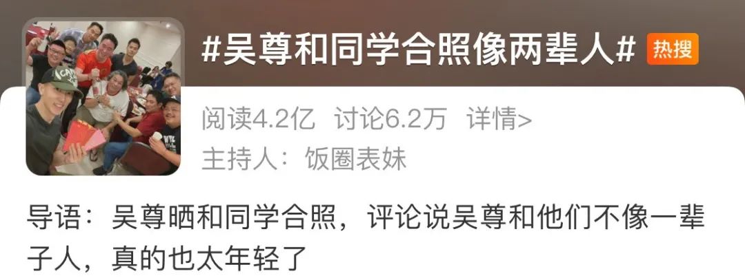 前几天,吴尊参加同学聚会又上热搜,引起了4.2亿人阅读6.2万讨论。