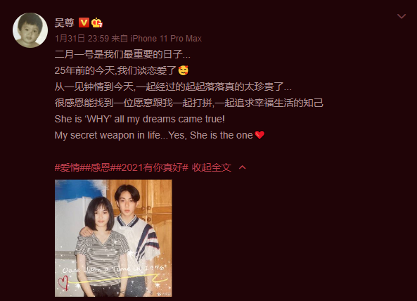 上个月吴尊还发微博,纪念一下谈恋爱25周年。