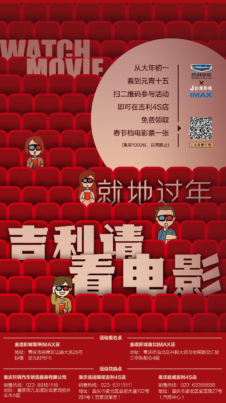 如果你是金逸影城的电影迷,那么在金逸影城南坪IMAX店(协信星光时代6楼)、渝北IMAX店(兰亭新都会4层)均有“吉利请你看电影”海报,找到海报扫描活动二维码即可报名。报名成功后,即可前往吉利主城3家4S店免费兑换金逸影院电影兑换码一张。
