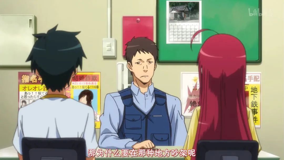 正当二人被眼前世界震惊之时,身着Cosplay风格的服装,身上布满械斗后留下的痕迹,看上去鬼鬼祟祟的魔王和艾谢尔立马就被执勤的警察叔叔注意到。
