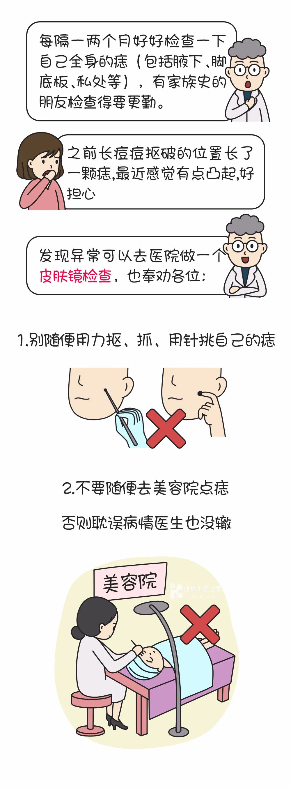 医生建议,如果觉得痣有异常,比如痣边界不规则,颜色发生变化,直径增大等情况,一定要及时上医院,尤其是手掌、脚底和其他摩擦大的地方。