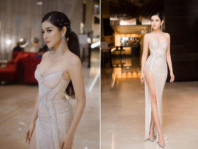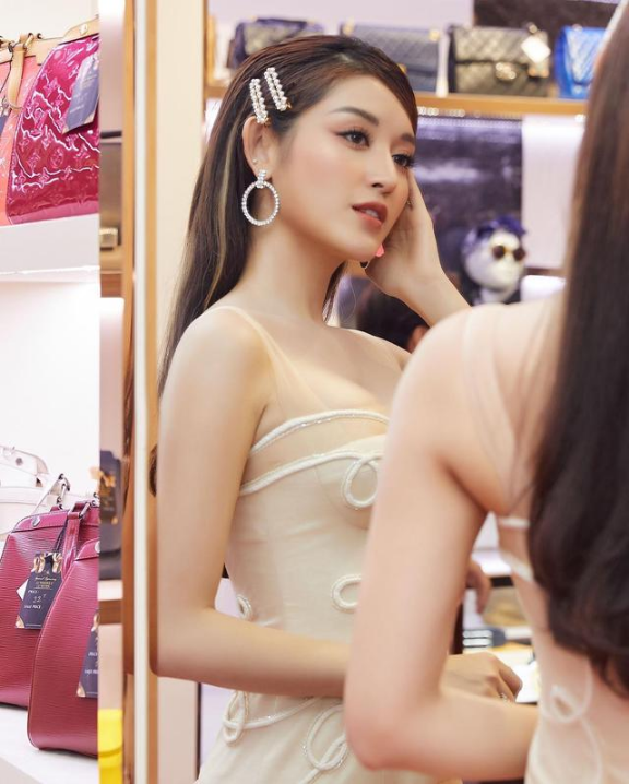 能够和这件裙子相搭配的首饰,应该当属金银饰了,NguyenTranHuyenMy选择的是,镶砖的大耳环、戒指和发夹,让这一身的搭配顿时显得高贵优雅。